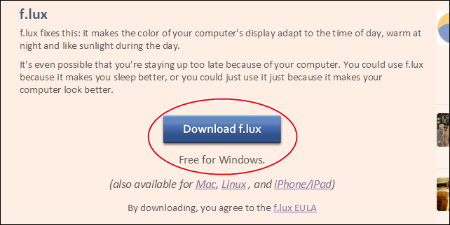 프로그램 홈페이지에서 f.lux(플럭스)를 다운로드 한 후 프로그램을 실행합니다.