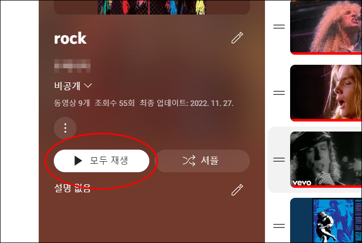 우선적으로 해야할 것은 재생 목록을 생성하는 것입니다. 예를 들어 아래와 같이 ROCK 음악을 재생목록을 생성해 둔 상태에서 모두 재생을 눌러 전체 재생을 실행합니다.
