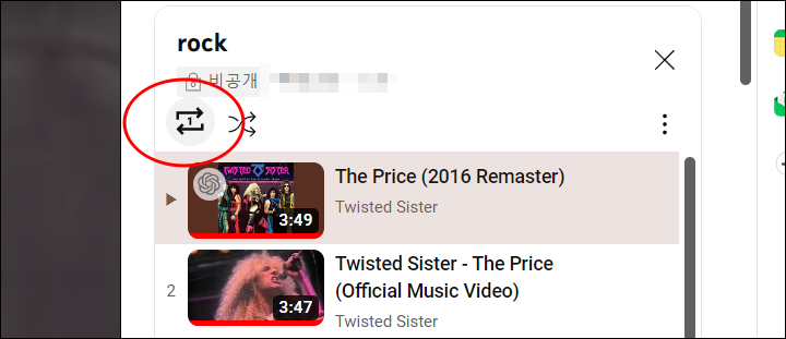 이렇게 설정하면 생성한 목록에서 무작위로 유튜브 반복 재생 기능이 활성화 됩니다.