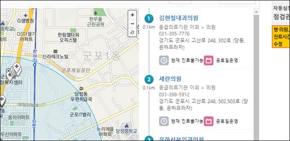 위치를 내동네 근처로 설정한 후 리스트에 나오는 병원들을 쭉 검색해 봅니다.